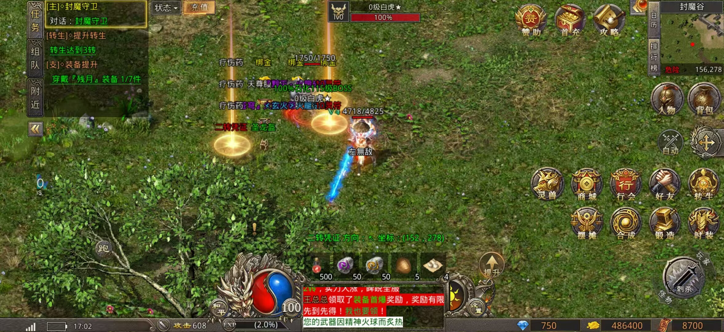 灵兽系统:高级灵兽可通过挑战BOSS获取灵兽升级:灵兽升级需要吞噬对应等级突破丹所有怪物均会掉落突破丹,更换灵兽后等级完美继承BOSS石化:灵兽攻击可将等级低于石化等级的B0SS 100%石化。石化等级=主角等级+灵兽石化等级觉醒技:觉醒技可对怪物造成巨大伤害,可通过首充获得。也可打怪收集素材合成
